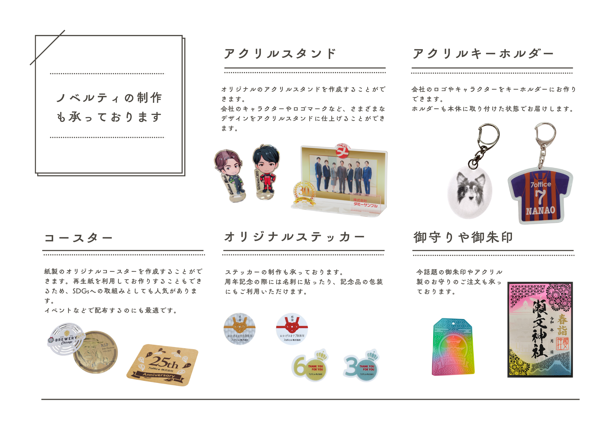 アクリル製品をはじめ、アップサイクルペーパーを使用したコースターなど、貴社独自のノベルティグッズを制作いたします。